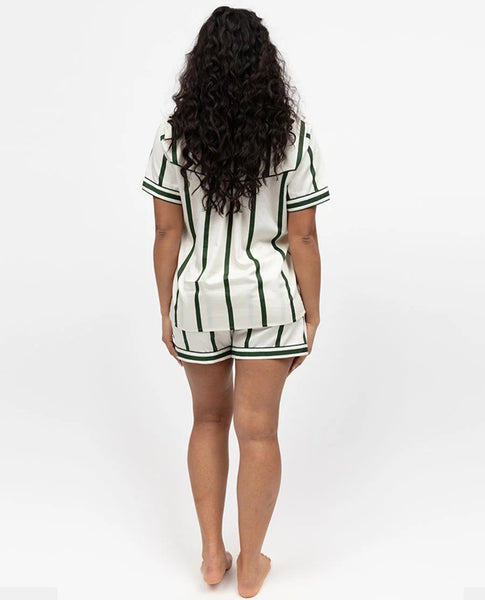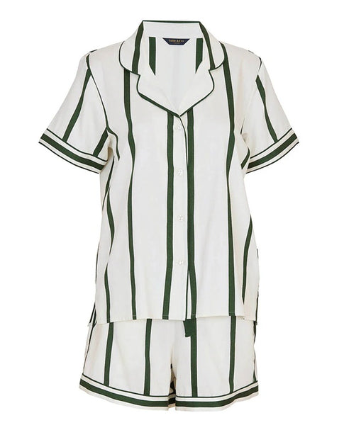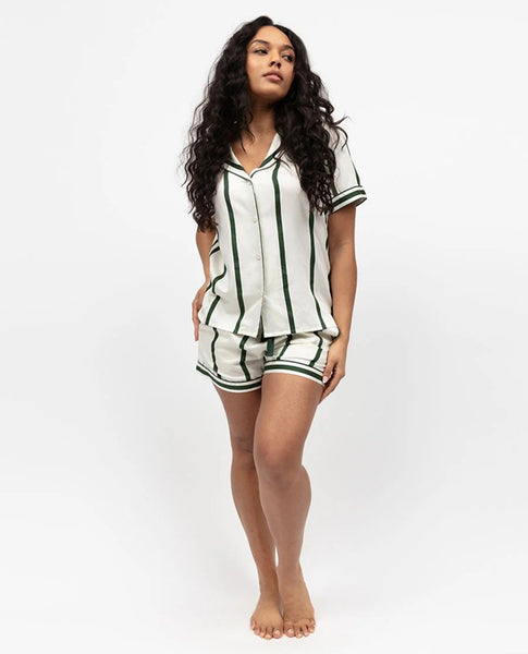 Evenings are better when you can just sink into them, and the Maida Vale Olive Green Mix Woven Printed Stripe Short Sleeve Shorty Set is designed for exactly that. Made from a silky-soft blend of 68% modal and 32% cotton, it drapes effortlessly, giving you that light-as-air, barely-there feeling the moment you slip it on.